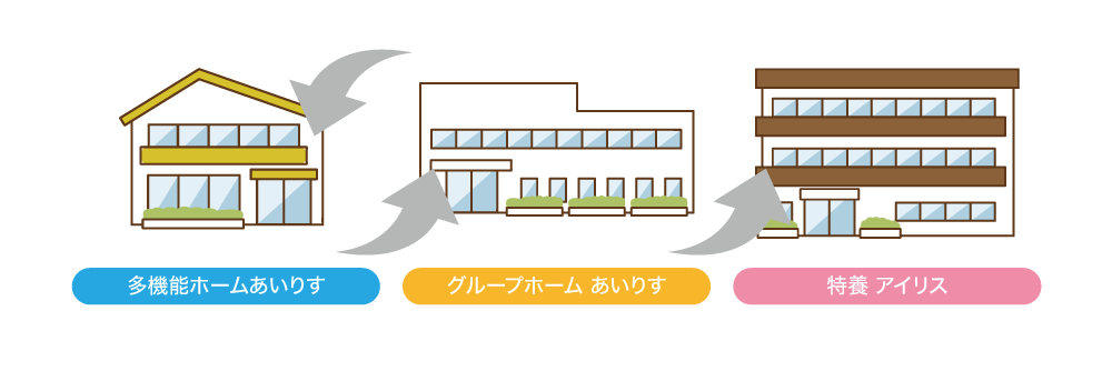 将来的に介護が重度化し、グループホームでの暮らしの継続が難しくなった場合でも、当法人が運営する特別養護老人ホームへの住み替えにより、慣れ親しんだ川越の地で一生涯暮らし続けることが叶います。