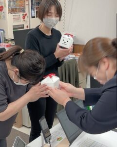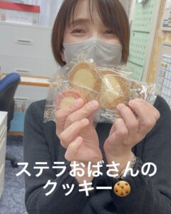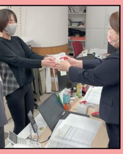 笑顔の施設長から可愛いプレゼントのお手渡し。